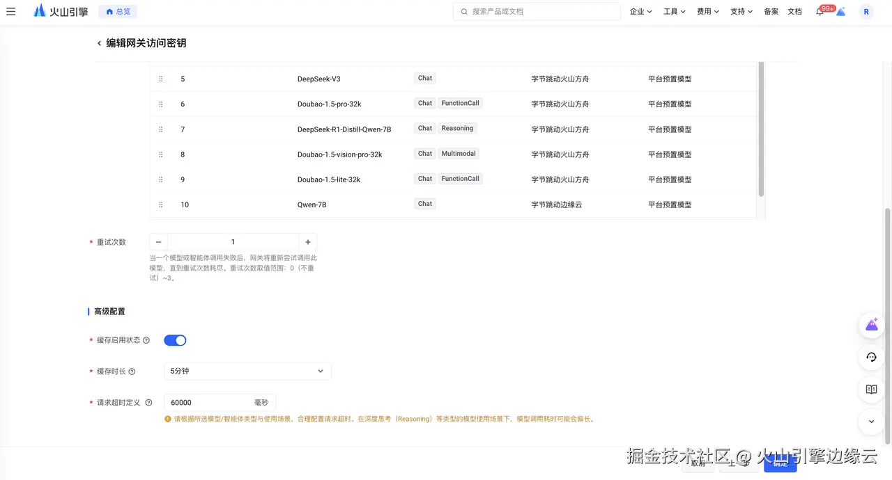 通过启用缓存,边缘大模型网关会就近将调用结果返回并缓存在边缘节点,从而缩短重复查询的响应时间并为您降低调用成本。可设置缓存的保留时长,一旦超过指定时长,缓存将被清除。通过定义请求超时时间,您可以设置单次模型调用的超时时长,模型请求发出后,若在超时时长内未收到响应,则判定该请求失败。当您调用支持深度思考(Reasoning)的 DeepSeek 模型时,请根据使用场景判断是否需要适当延长请求超时定义。