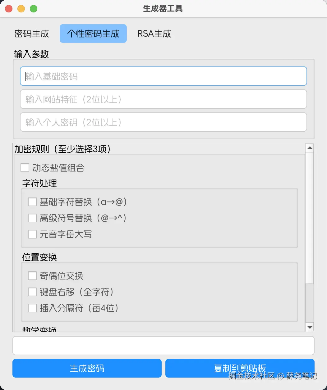 包含密码生成、个性密码生成(推荐使用)以及 RSA 密钥生成等实用功能。
