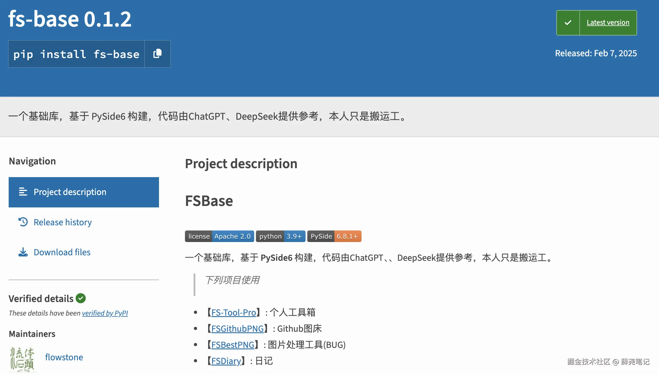 在后续开发过程中,我新编写了一个 Github 图床应用。为了提高代码的复用性和可维护性,我将两个应用中的共同逻辑代码进行了提取,封装成了一个独立的 Python 包,并将其发布到了 PyPI 上,这个包的名称为 fs-base。