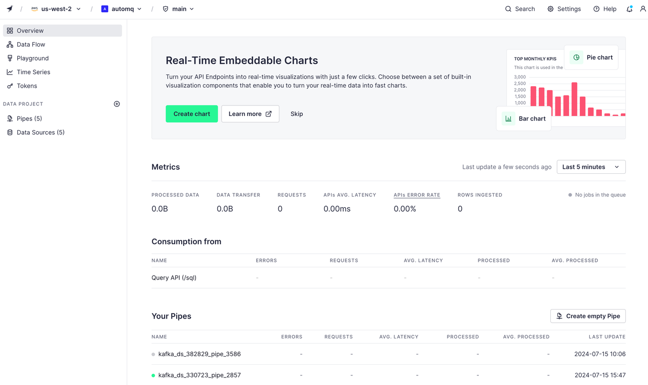 现在我们成功地建立了 AutoMQ 与 Tinybird 的连接,并利用 Tinybird 支持的 SQL 进行了数据分析操作。