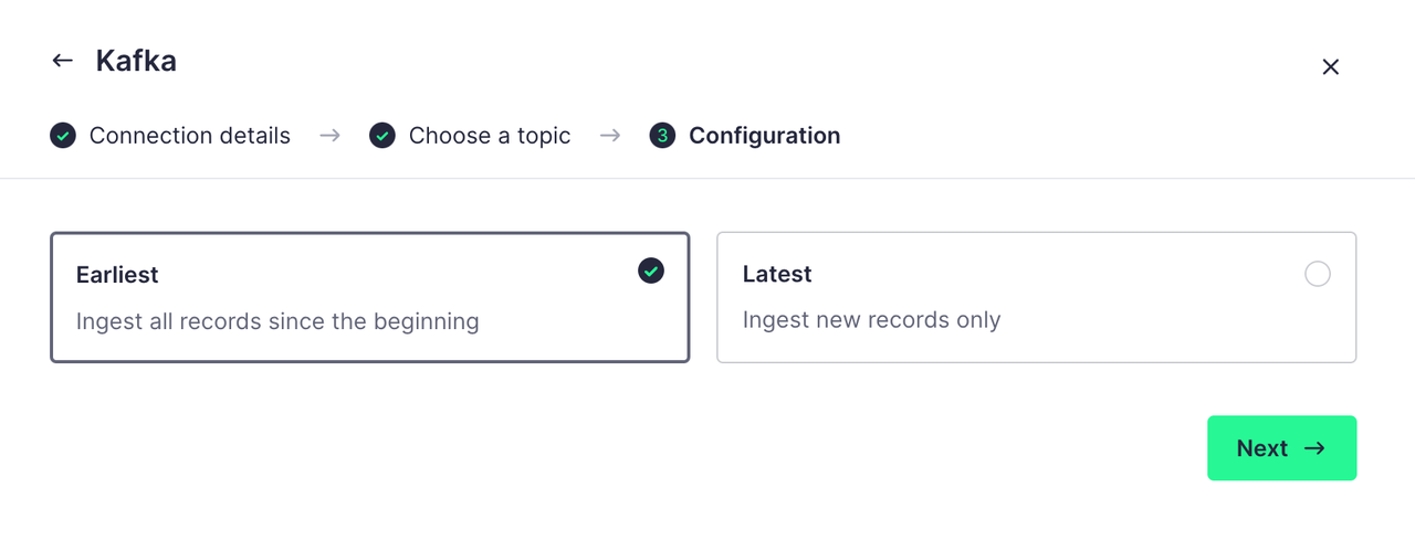 在下一步的配置中,我们可以选择一开始就获取所有的记录或者只获取创建数据源后新追加的记录,我们这里选择第一个: