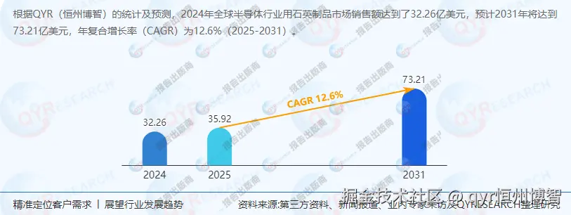 全球市场规模:根据QYResearch最新调研报告显示,2024年全球半导体行业用石英制品市场销售额达到了32.26亿美元,预计2031年将达到73.21亿美元,年复合增长率(CAGR)为12.6%(2025-2031)。