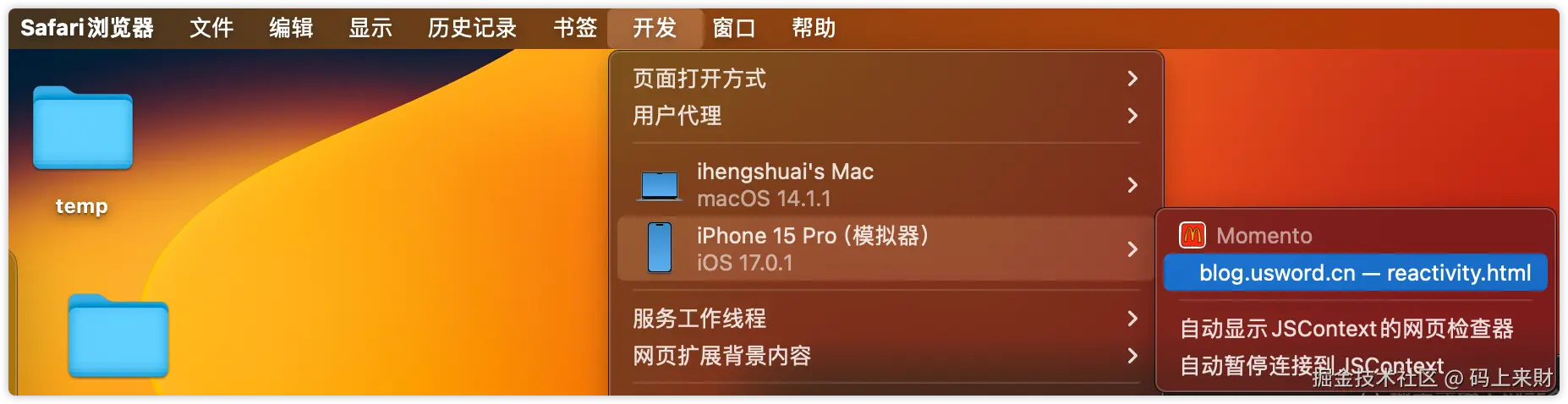 然后在Mac上打开Safari浏览器,在工具栏上,点击开发 -> 对应的设备 -> 网页就可以了