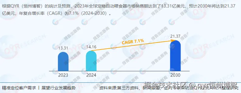 全球市场规模:根据QYResearch最新调研报告显示,2023年全球宠物自动喂食器市场销售额达到了13.31亿美元,预计2030年将达到21.37亿美元,年复合增长率(CAGR)为7.1%(2024-2030)。这表明全球宠物自动喂食器市场在未来几年将保持平稳增长态势。
