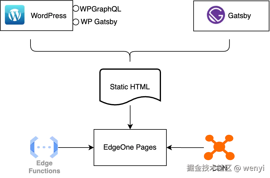 核心思想就是把 WordPress 作为一个 CMS,输出静态 HTML 到 EdgeOne Pages 部署,用户访问目标为 Pages 部署站点,而不是WordPress的服务器,把服务器资源节省下来。