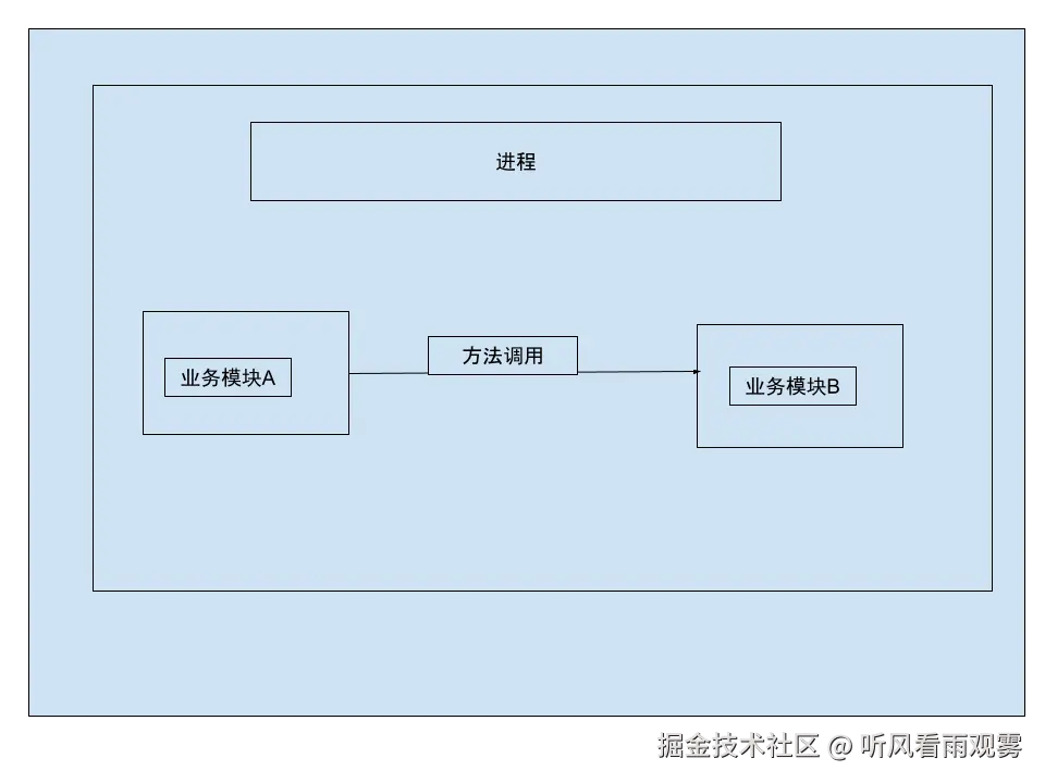 单体架构就是一个服务之中,多个业务模块作为该服务的一部分存在同一个进程之中(这个与微服务不同,微服务是将一个服务的多个业务模块抽离出来作为多个独立的小型服务,因此是多个进程),多个业务模块通过方法调用的方式进行通信。