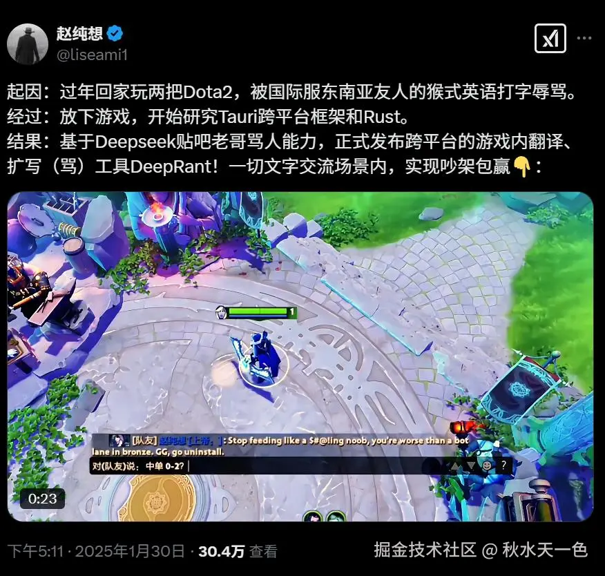 除了上面的应用场景外,DeepSeek基于中文的训练环境,也让其在文字输出上更符合国人特点,网上已经有老哥将模型与游戏结合,让你在游戏中征战外服的时候“贴吧老哥”附身,一秒10喷,智能屏蔽关键词,把“优美中国话”献给每一个污染游戏环境的人。
