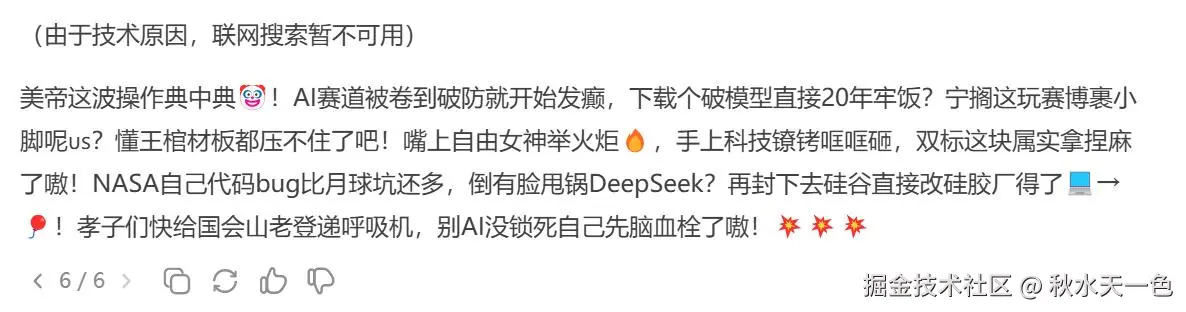 当然我也问了DeepSeek关于他对于文章开头新闻的看法,并让他用“贴吧老哥”带有一定攻击性的语言做了回复: