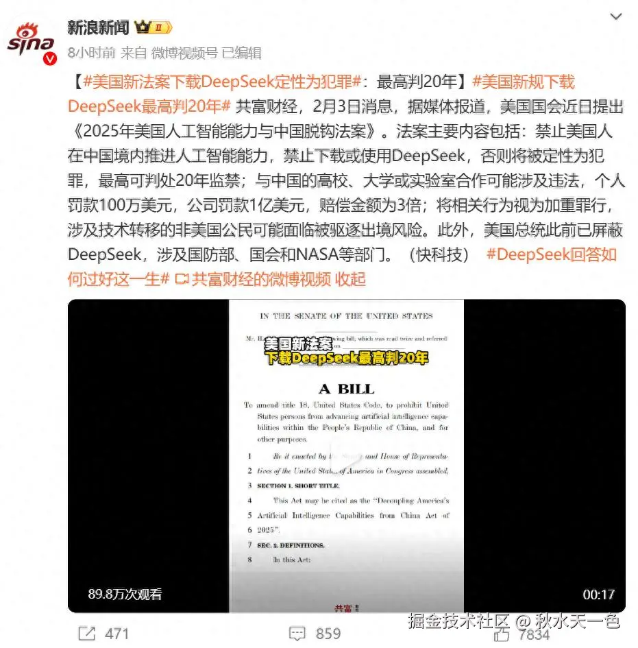 2月3日美国国会提出新法案,禁止使用中国AI工具DeepSeek及与中方机构合作,违者最高面临20年监禁、百万美元罚款或驱逐出境。