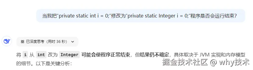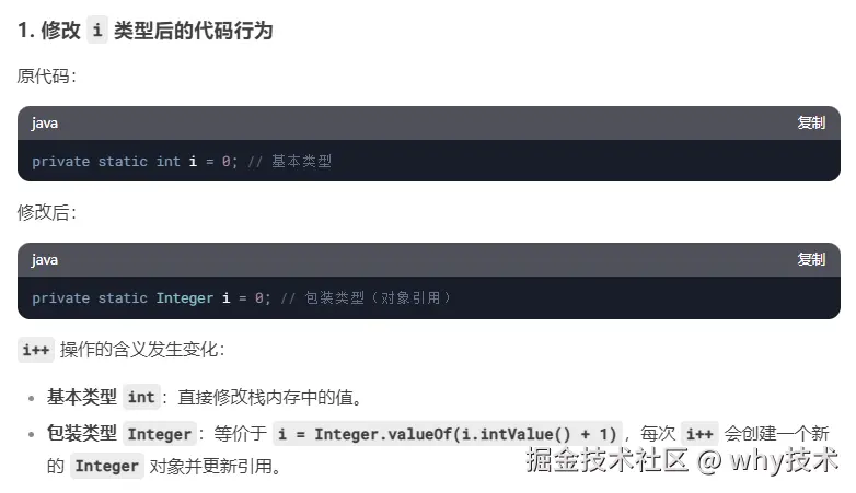 然后,我先把第二处微调,也就是把“把变量 i 从 基本类型 int 变成了包装类型 Integer”,给它,让它继续解释: