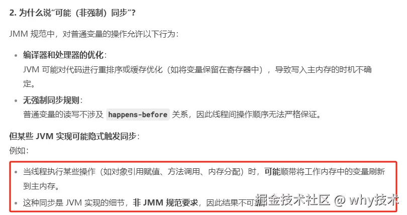 而在部分 JVM 实现中,对象引用的赋值可能隐含内存同步。