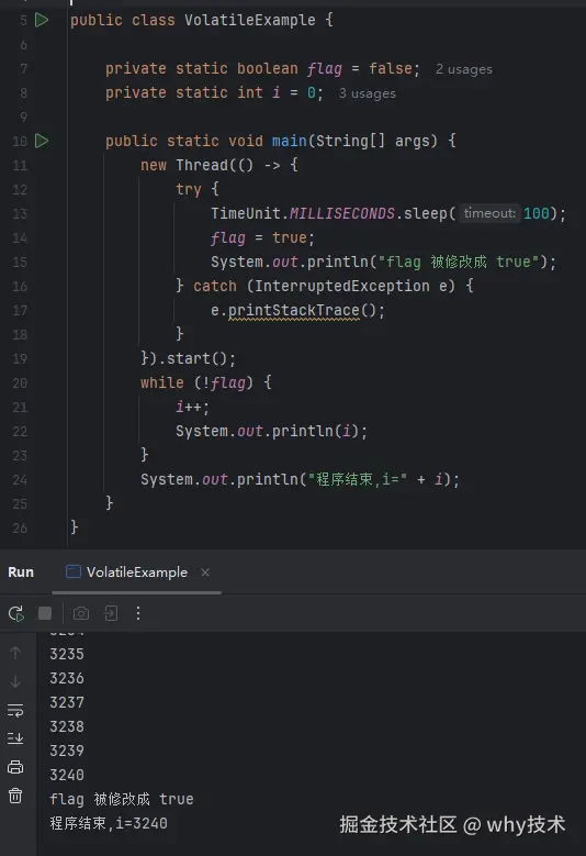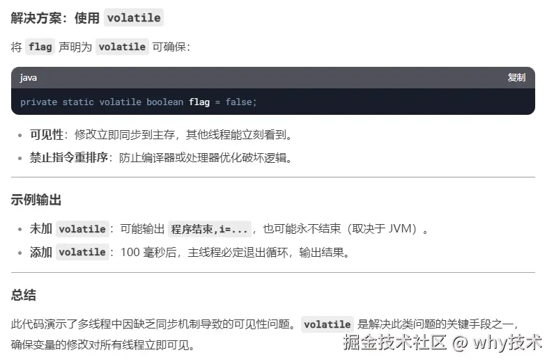 导致死循环的原因是 flag 变量不是被 volatile 修饰的,所以子线程对 flag 的修改不一定能被主线程看到。