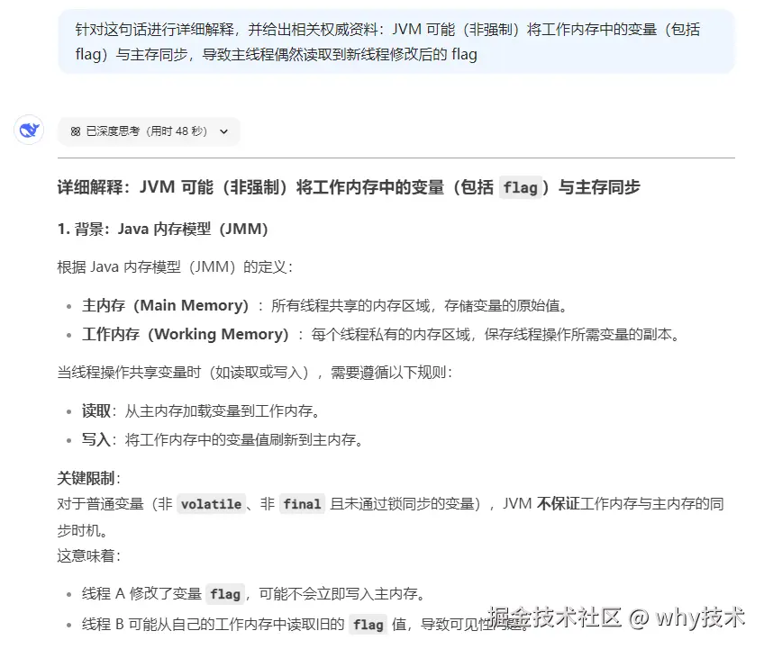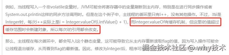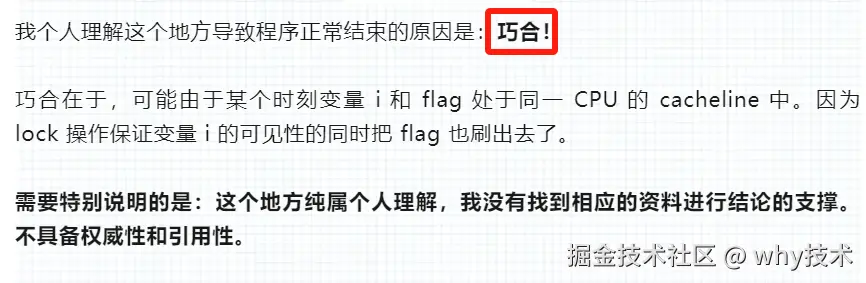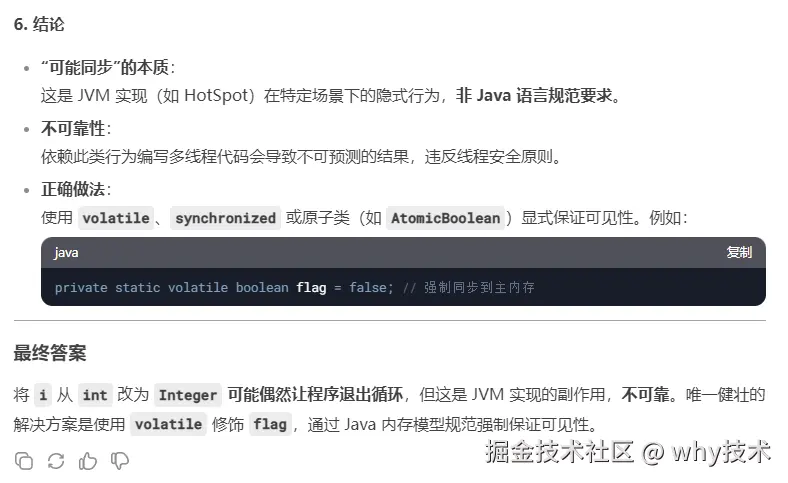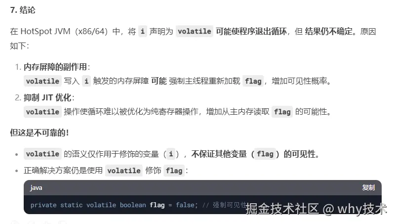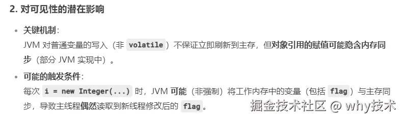 和前面包装类型的原因几乎一样,都是使用的 HotSpot JVM,都是触发了“内存屏障”,从而导致 flag 参数被可能被顺便从工作内存刷到了主内存中。