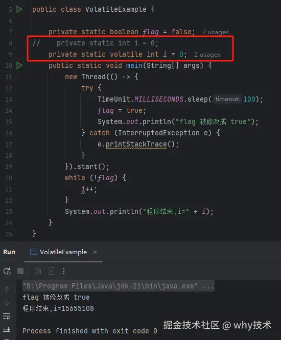 那么给 i 变量加上 volatile,为什么也能正常结束呢?