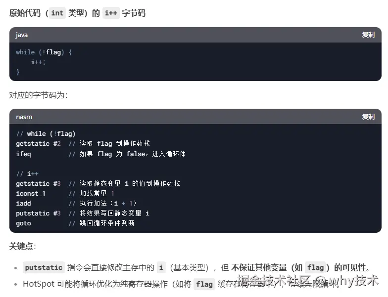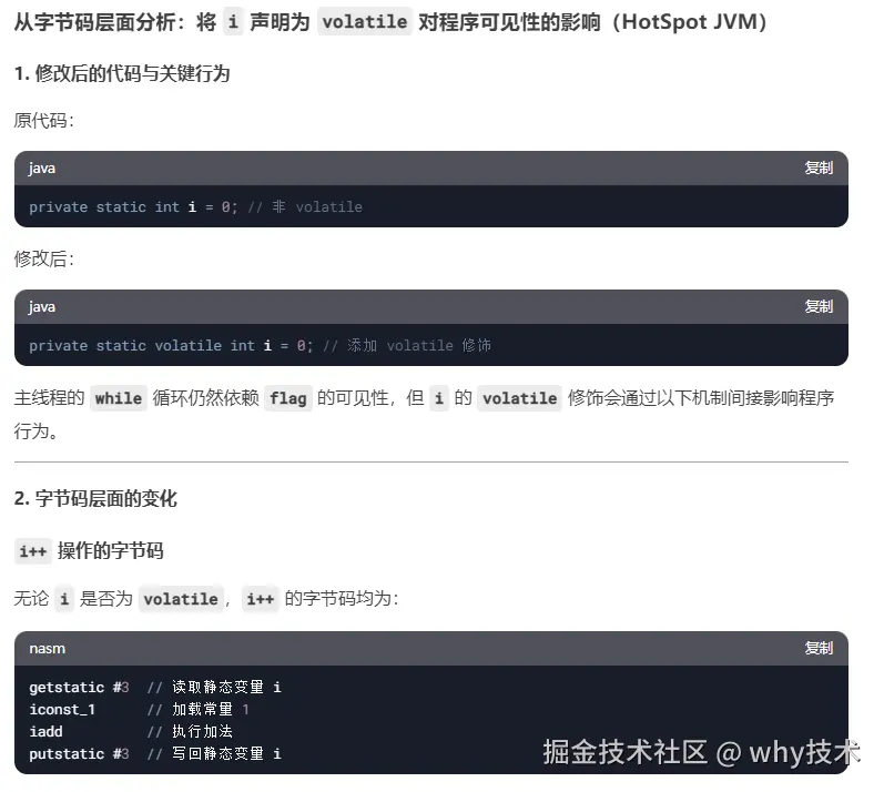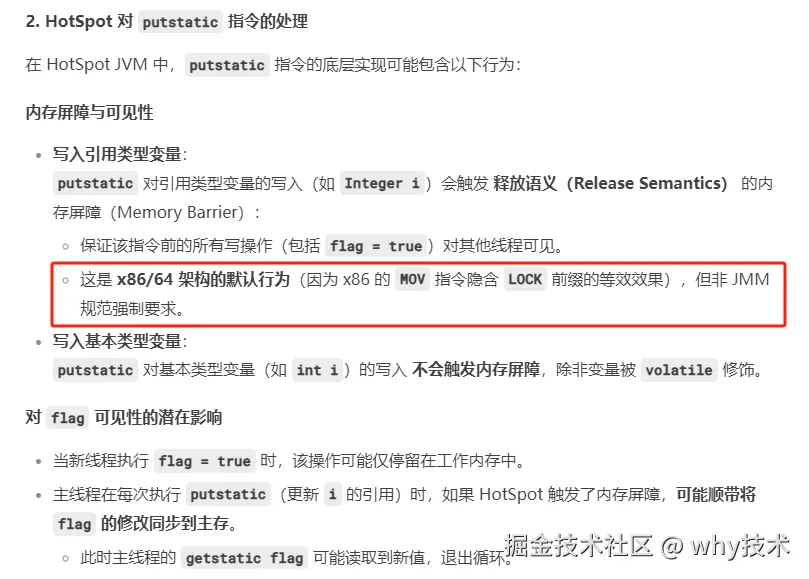 因为我是使用的 HotSpot JVM,上述代码变化,导致 i++ 对应的字节码含义发生变化。每次调用 putstatic 指令,更新 i 的引用时,会触发内存屏障,隐含的释放语义可能将 flag 的修改同步到主存。