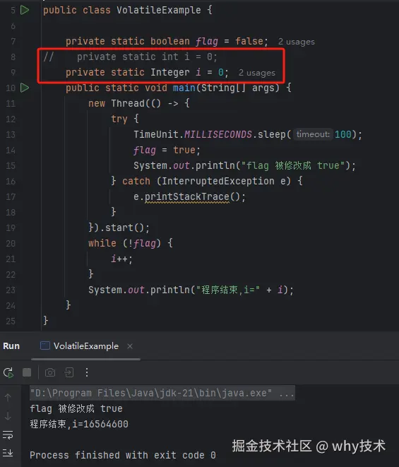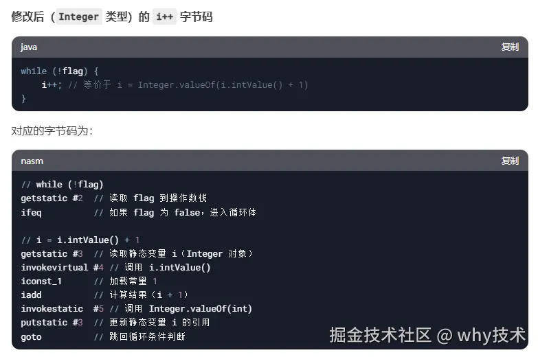 jvm 限定为 HotSpot,请从字节码的层面解释一下,当我把“private static int i = 0;”修改为“private static Integer i = 0;”程序是否会运行结束?
