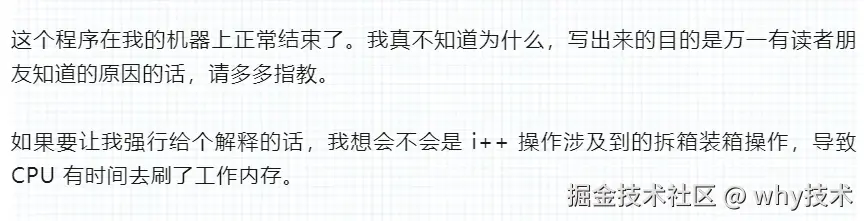 到这里,我基本上就清楚“把变量 i 从 基本类型 int 变成了包装类型 Integer”之后程序就能正常结束的原因了。
