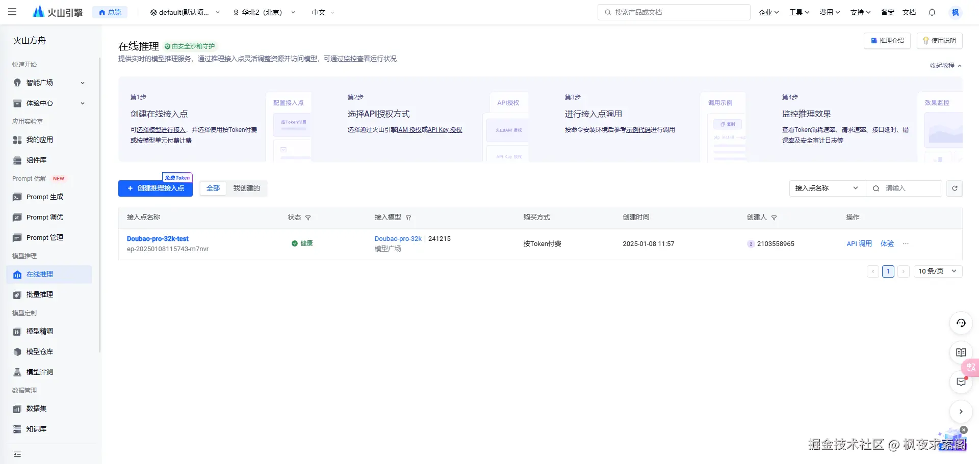 - 进入火山方舟控制台,点击在线推理,创建推理点