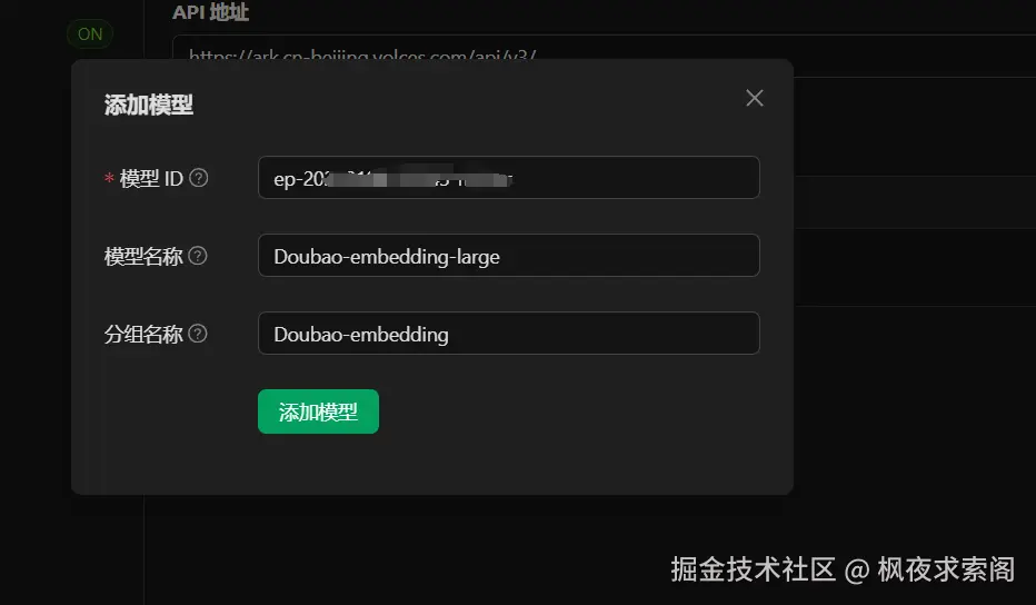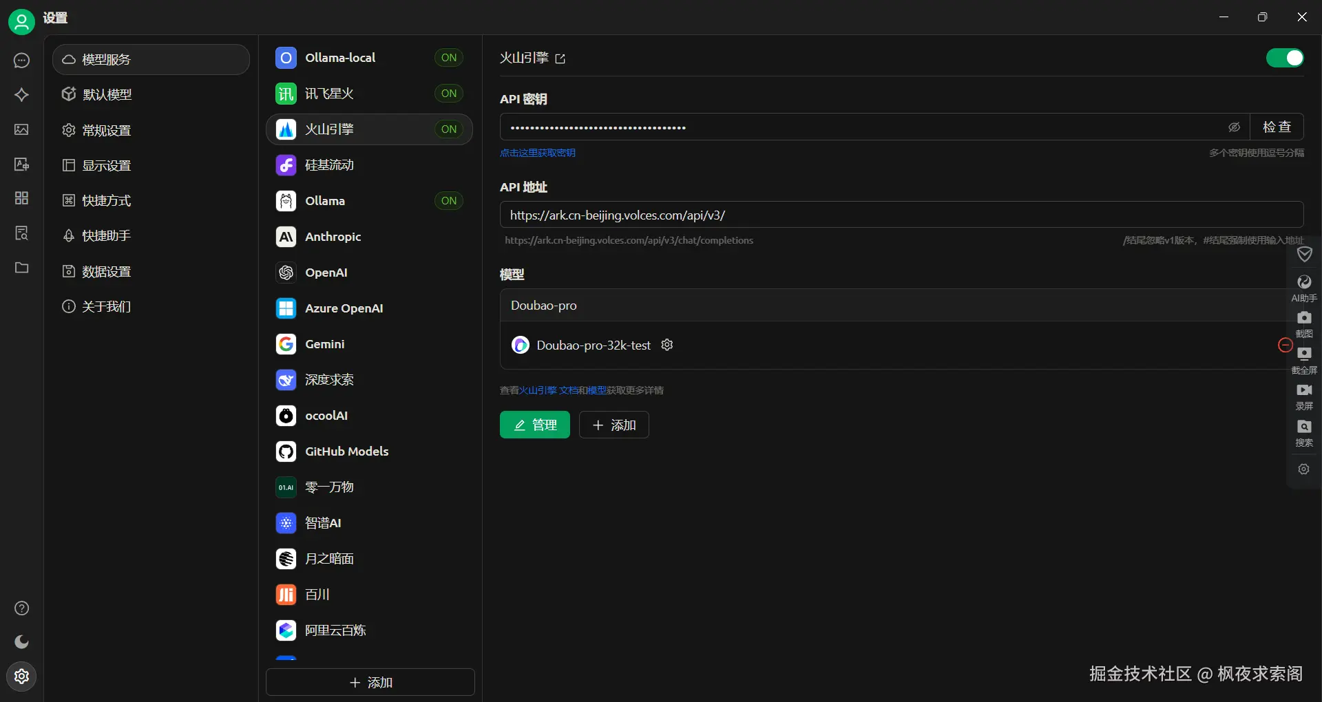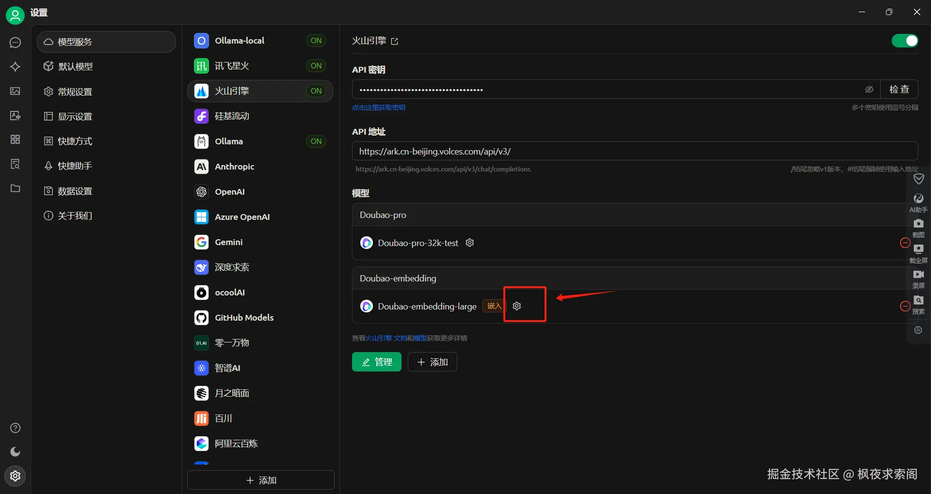 - 打开cherry-studio(github.com/CherryHQ/ch…),点击配置页面,点击火山引擎,配置如下:
