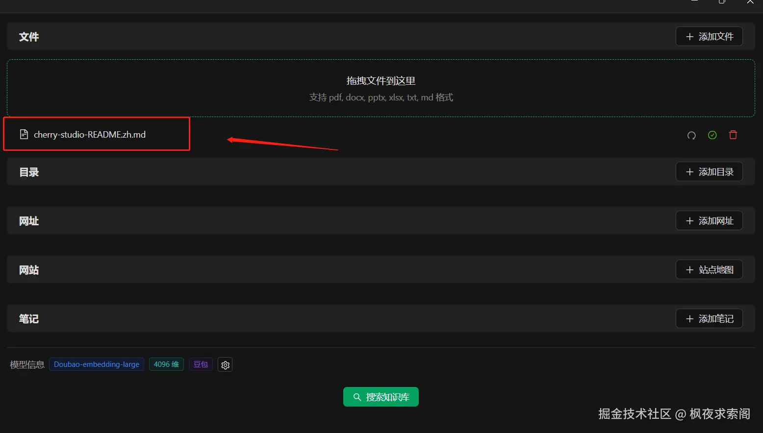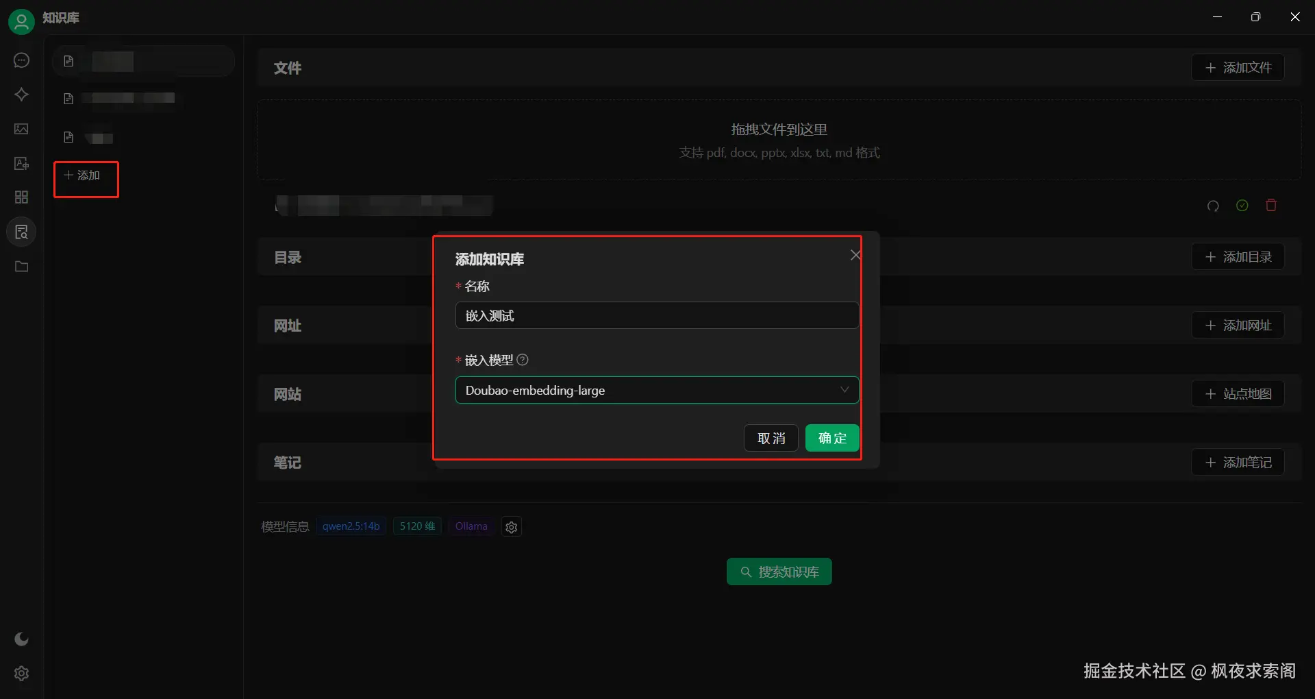 打开cherry-studio的知识库,添加知识库,然后模型选择刚刚新增的模型: