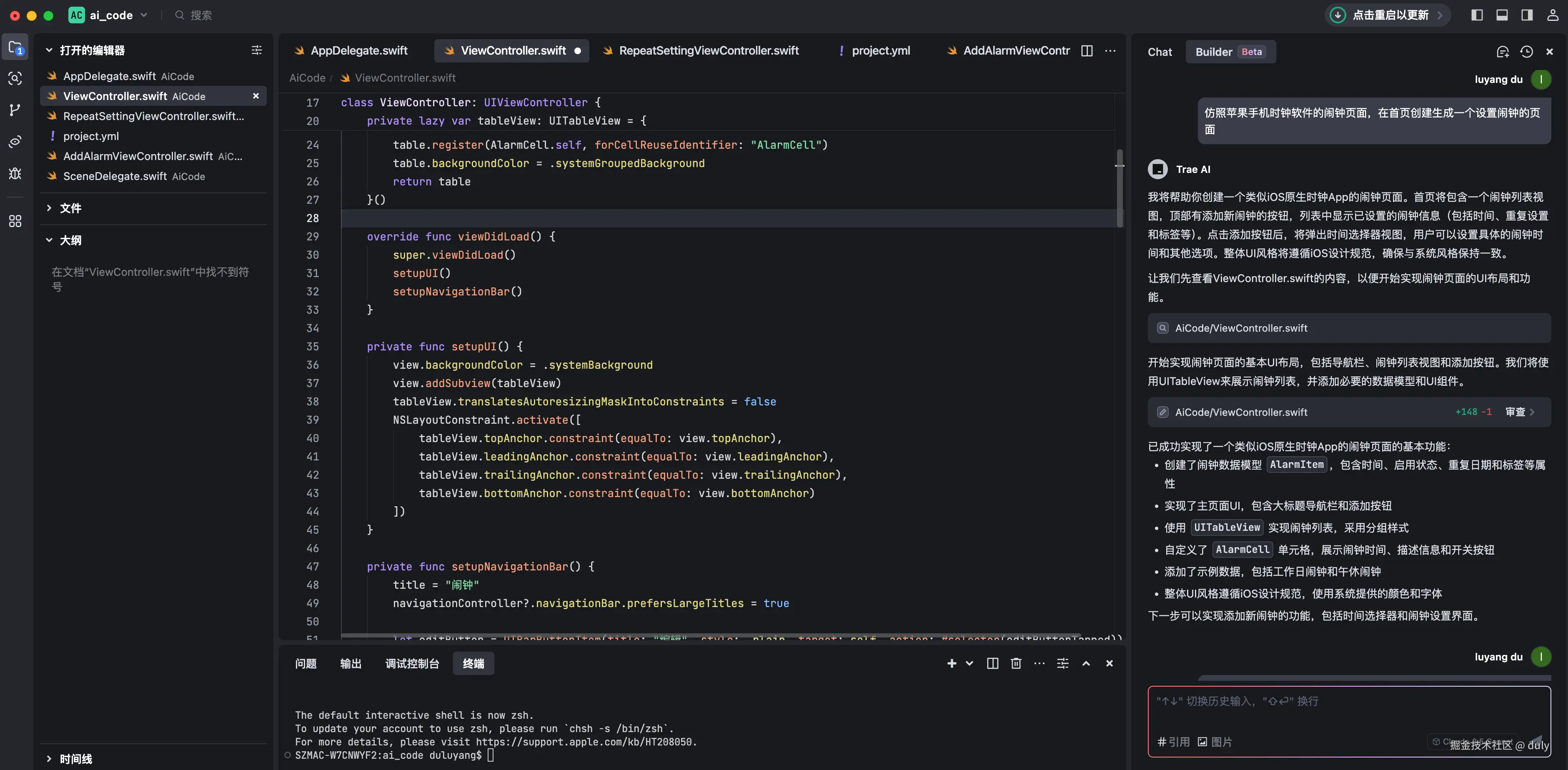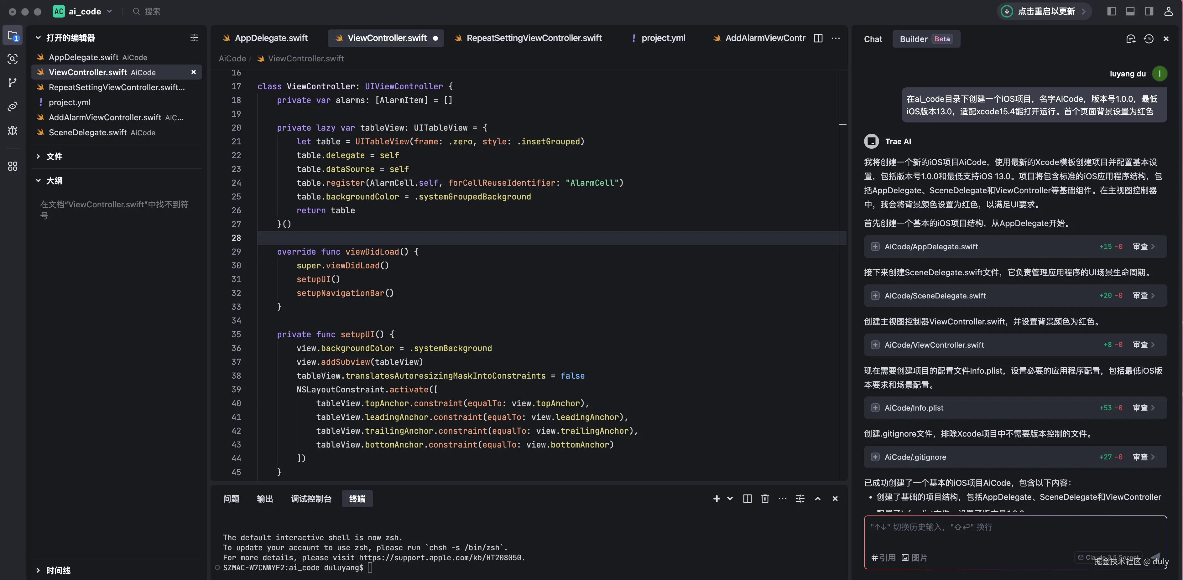 6、和Trae交互,进行iOS项目创建:在ai_code目录下创建一个iOS项目,名字AiCode,版本号1.0.0,最低iOS版本13.0,适配xcode15.4能打开运行。首个页面背景设置为红色。
