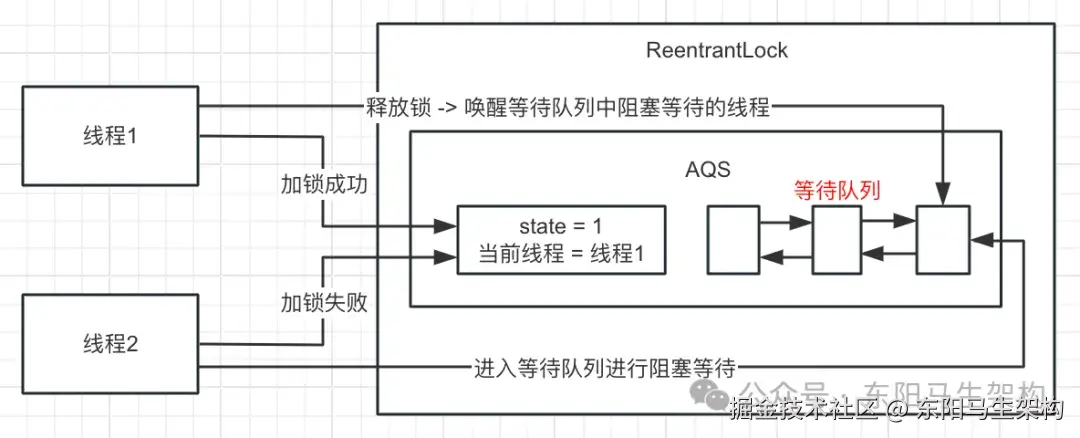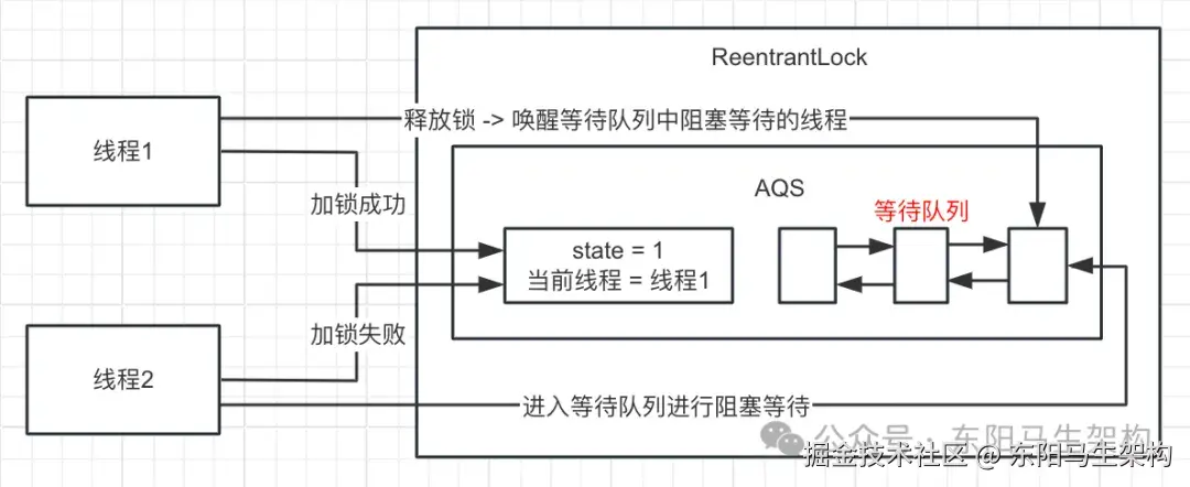 获取锁失败的线程会被加入到AQS的等待队列中,然后进行自旋 + 阻塞等待。