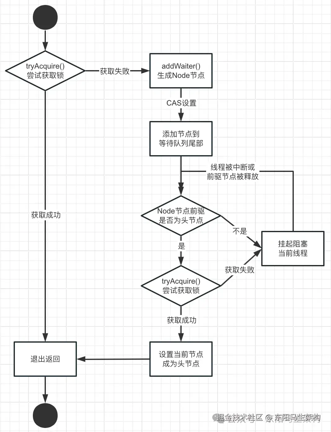 acquire():独占式获取同步状态,该方法会调用子类重写的tryAcquire()方法;获取成功则返回,获取失败则当前线程会进入等待队列等待;