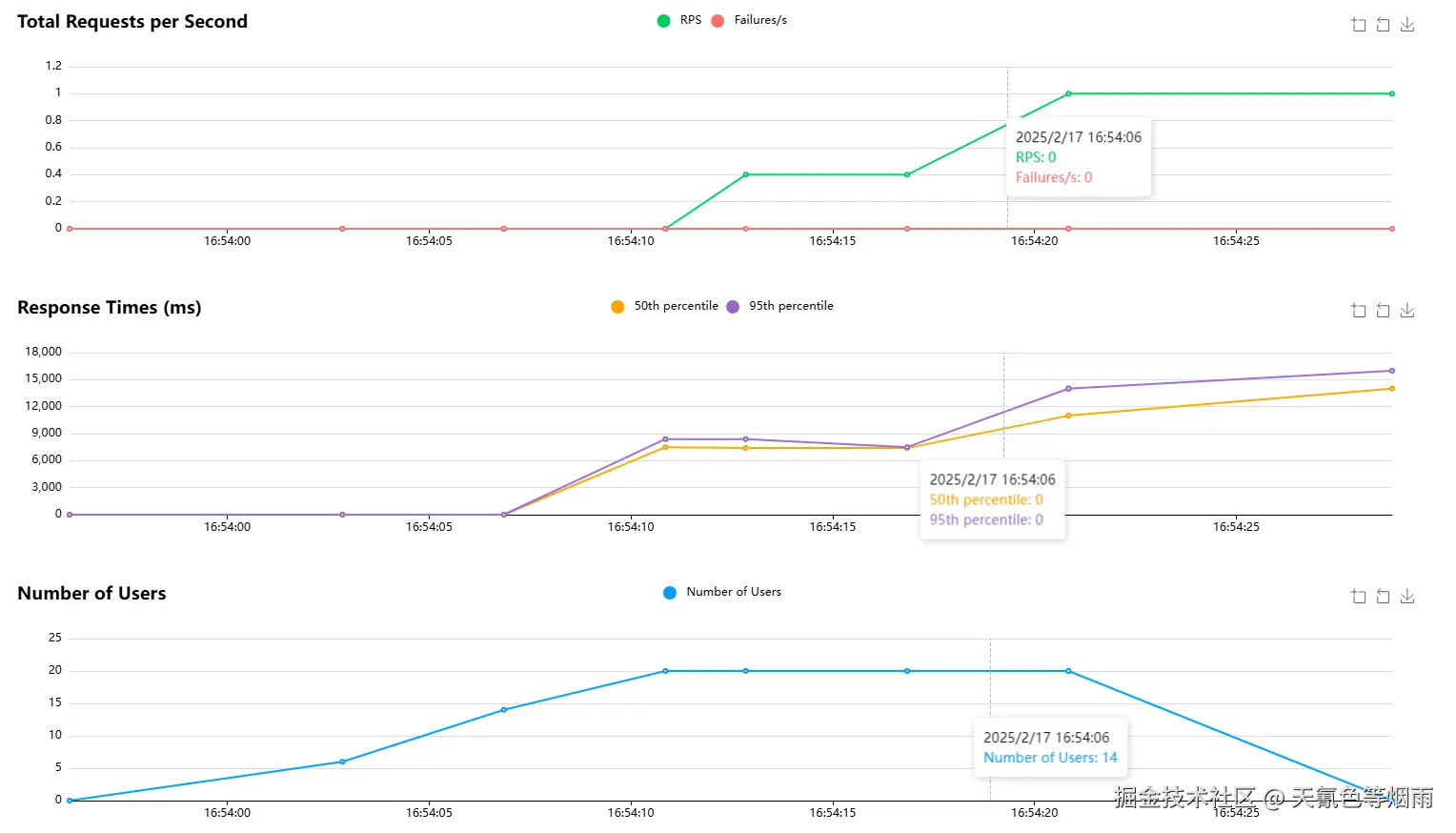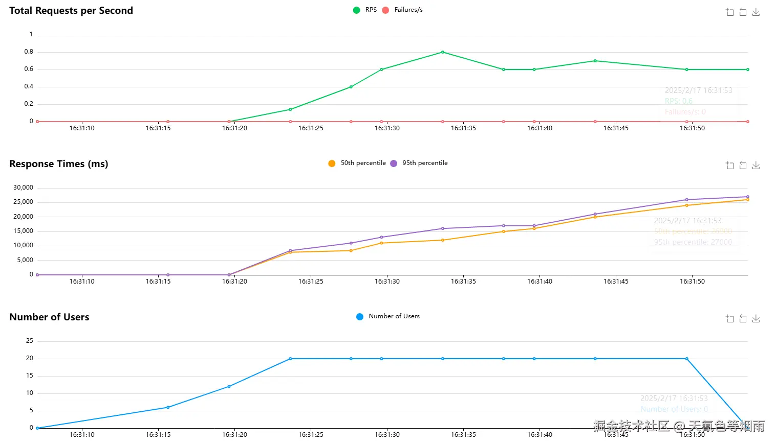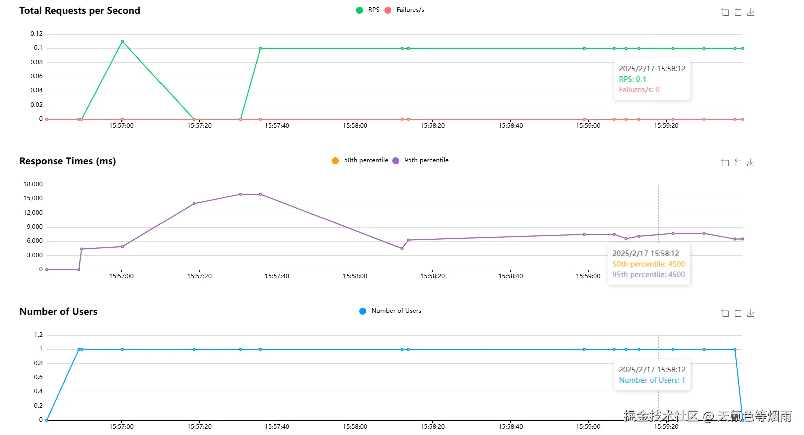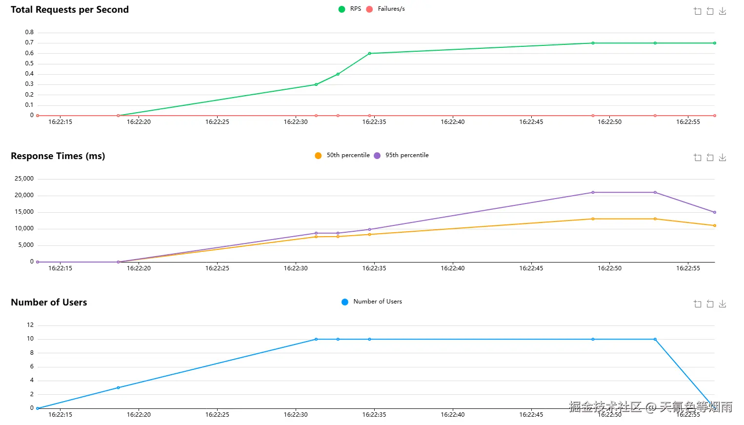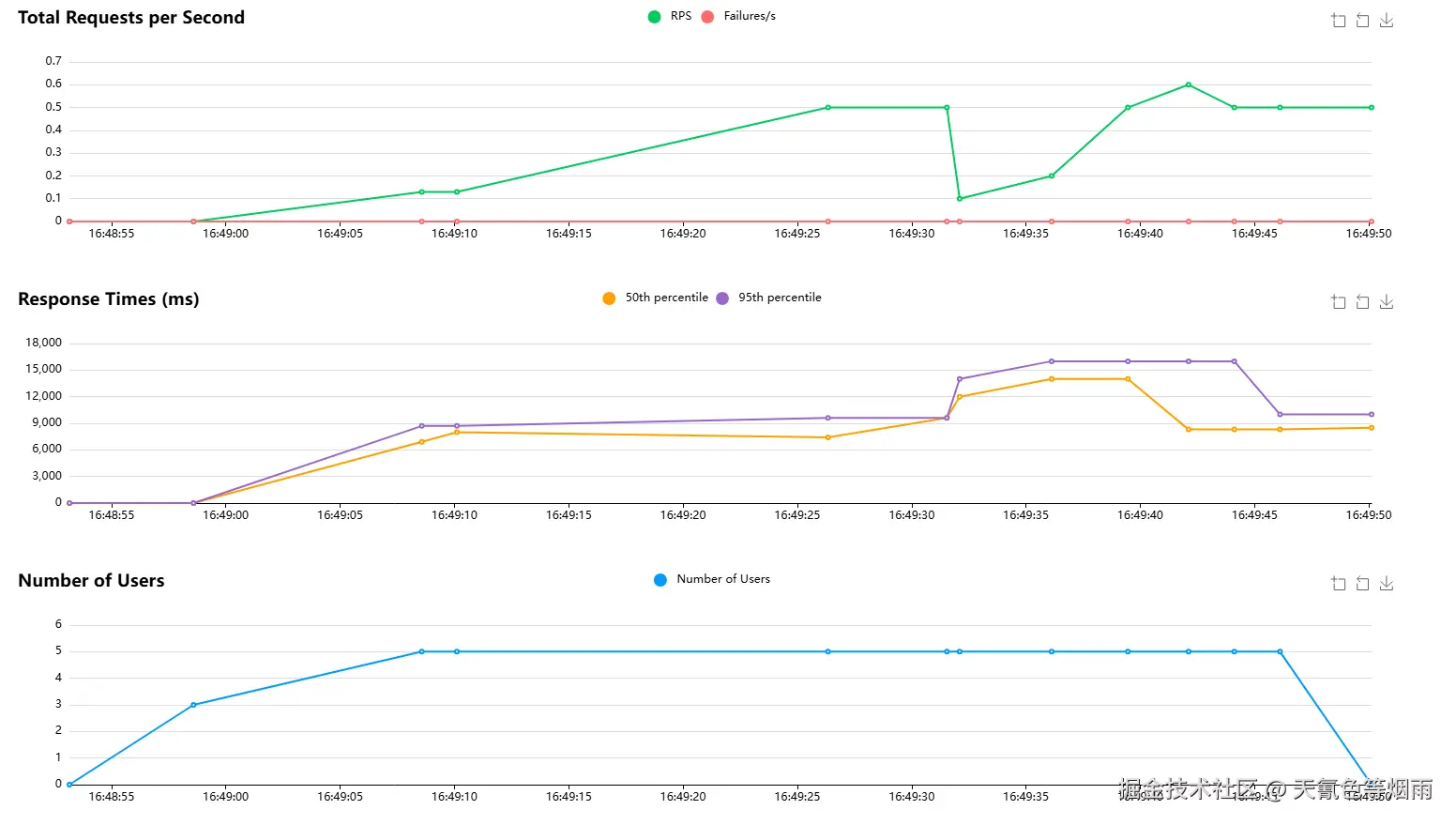 测试结果图表输出 (图表依次为:每秒请求个数RPS,请求响应时间,用户/线程数):