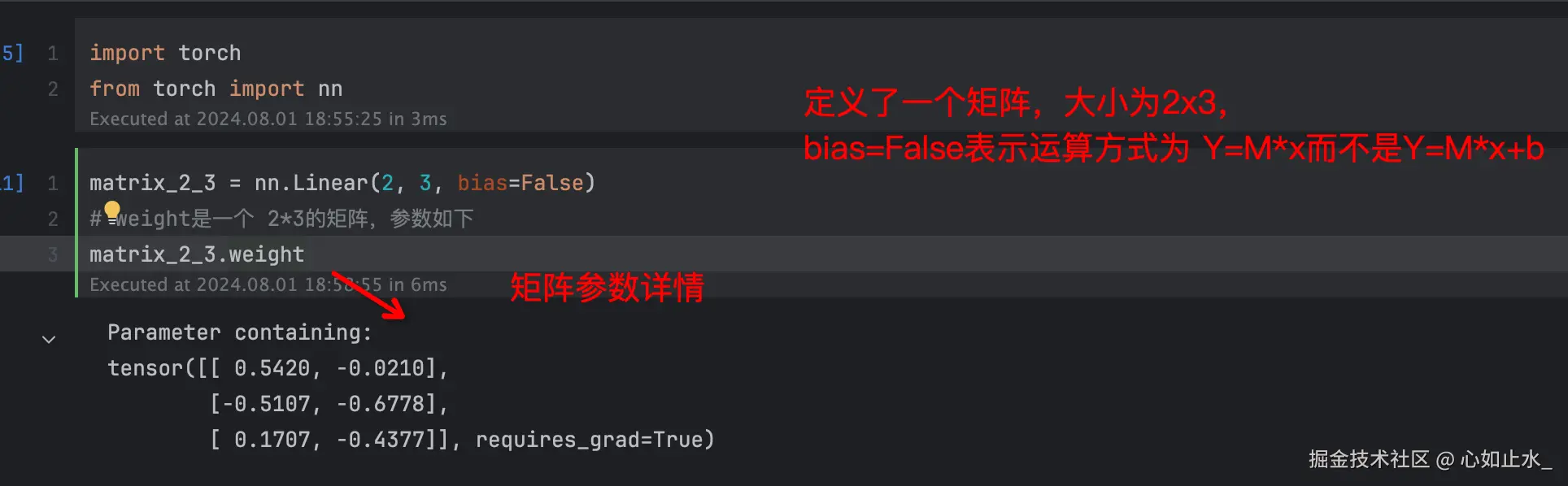 下面这个例子定义了一个2*3的矩阵matrix_2_3.weight,