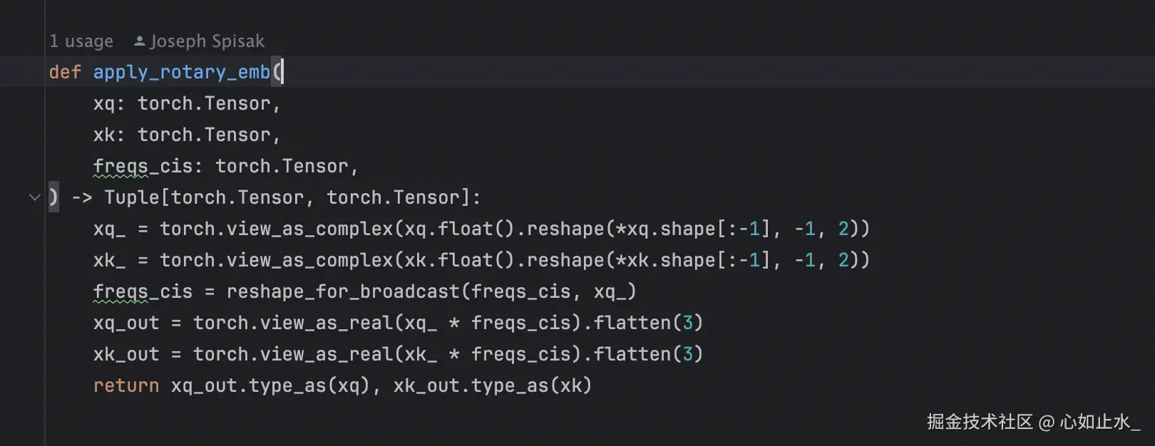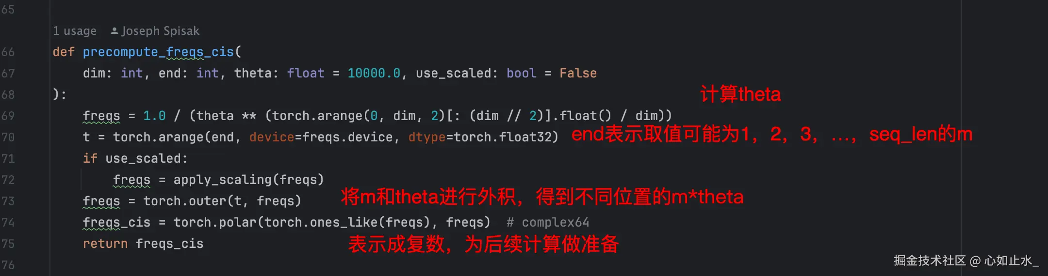 - 根据传入的start位置,从初始好的rope复数角度变量中取出seqlen长度的复数角度,为后续在 attention 的模块中给query、keys带上旋转位置编码做准备。