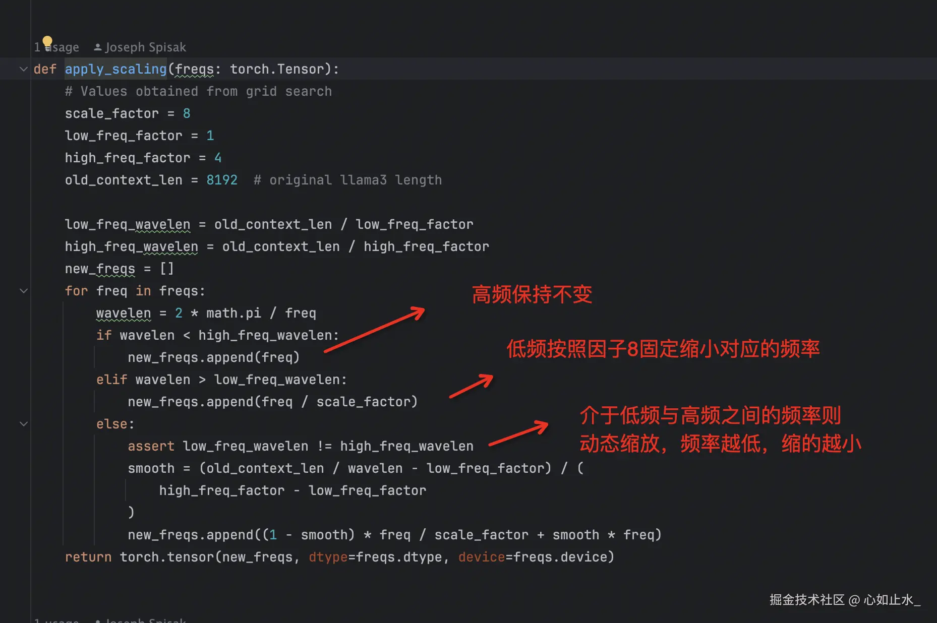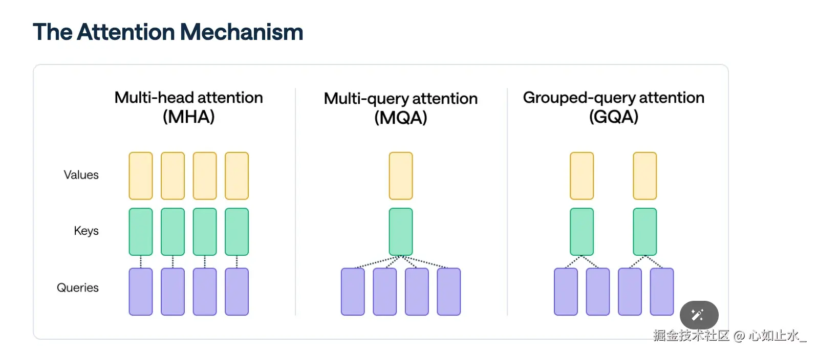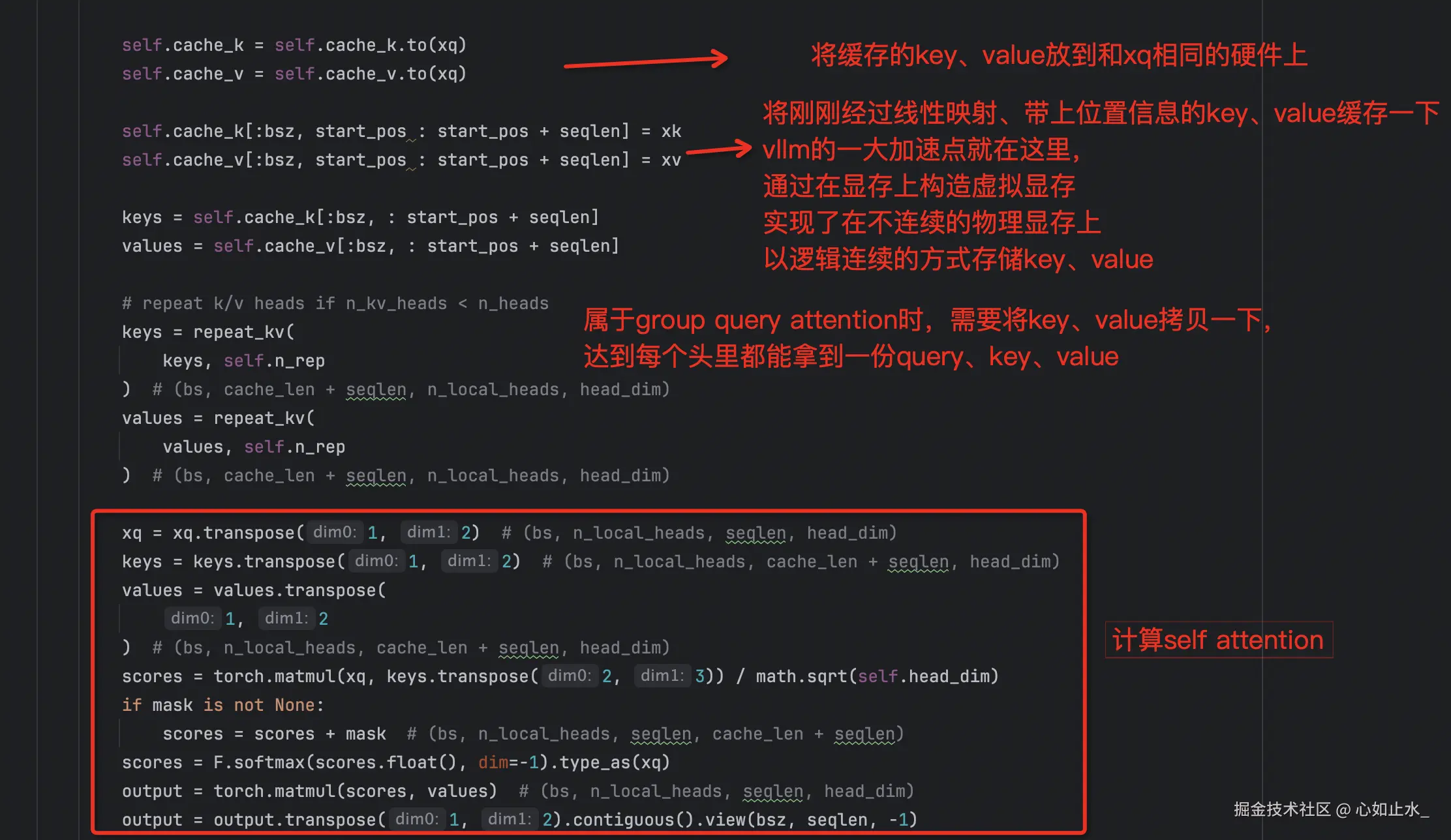 注意力模块是整个模型架构中最难理解的一个模块,包含了旋转位置编码,ntk缩放角度频率,query、key、value间的masked self attention计算,key和value的缓存。