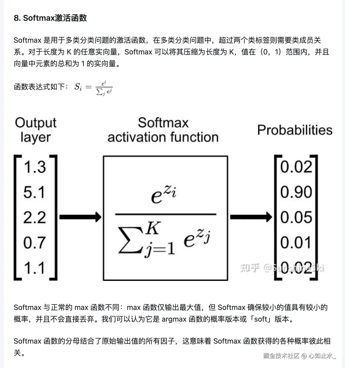 每个分量拿e取个指数,然后除以所有分量拿e取指数后的和,得到分量的归一化表示。