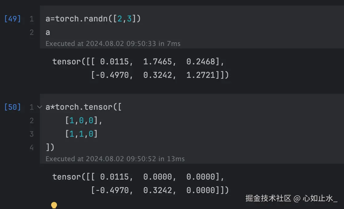 a是一个大小为(2,3)的张量,和另一个大小也为(2,3)的张量按位相乘结果如下