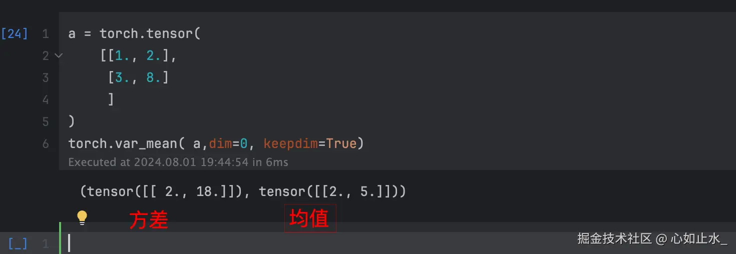 下述例子初始化了一个2*2的张量,dim=0,表示沿着维度0,也就是下述矩阵的列方向,分别计算平均值与方差,keepDim表示沿着计算的那列的维度会坍缩为1,但那列所在的维度不会消失。