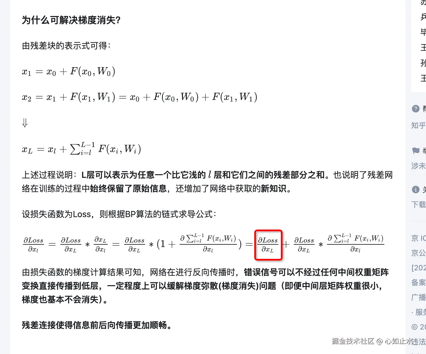 如果使用了残差链接,在反向传播计算loss的梯度时,梯度中有一项直接来自于loss对x的偏导数。如果不使用残差链接就没有这项,就只能通过中间权重矩阵传播回去,只通过中间权重矩阵传播回去的值可能非常小【梯度消失问题】。