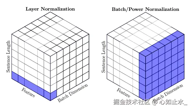 笔者理解下来,layer Normalization是对一个个 token 进行embedding后得到的向量进行归一【对应于上面2个立方体中左侧立方体中标蓝的那一个token向量】,而batch Normalization是针对一批数据在一个特征上进行归一【对应于上面2个立方体中右侧立方体中标蓝的那一面向量分量,每个向量分量都取自这批数据里每个token的embedding向量的第一个分量】。