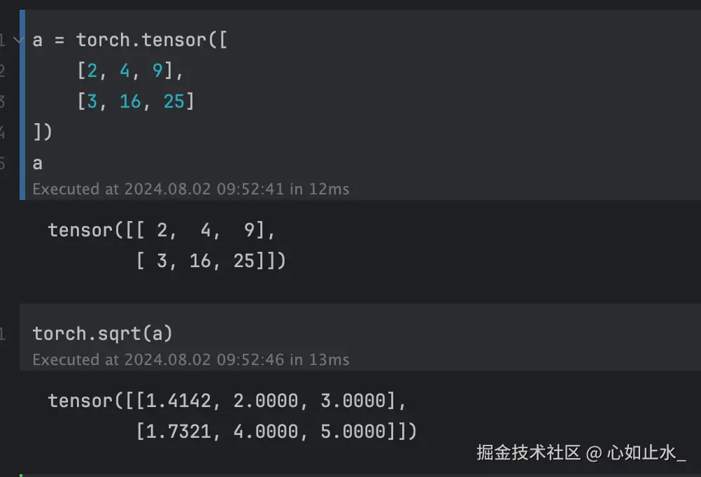 对输入张量的每个元素进行根号的计算,示例如下。