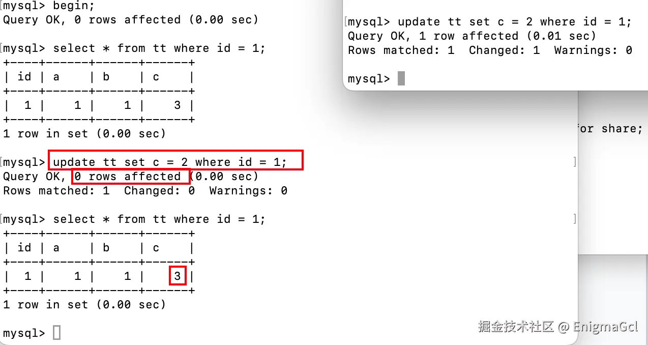 可以看到,事务自己修改的数据,结果自己看不到,这就是更新短路优化的影响