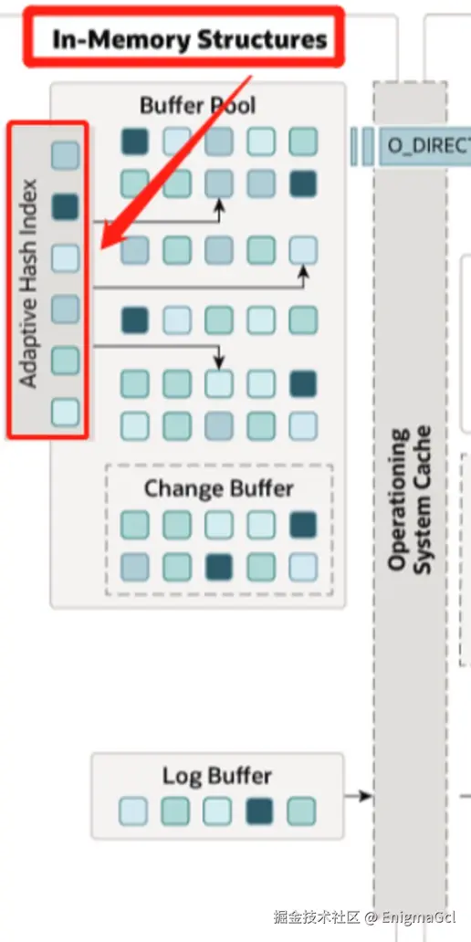 自适应 hash 索引,buffer pool 中的索引,buffer pool 中页也是按照 B+ tree 组织的,因此查询时间复杂度为 O(logN),如果某些页访问非常频繁,MySQL 会在 AHI 中直接创建 hash 索引,能将该页查询的时间复杂度优化为 O(1),如下图所示: