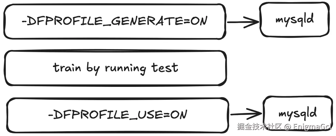 首先编译时添加参数 -DFPROFILE_GENERATE=ON 打开 PGO 功能,编译出 mysqld 后(仅后续收集用,线上不使用),利用测试集在这个 mysqld 上跑压测,压测过程中就会生成对应配置文件,用于后续优化,然后再打开参数 -DFPROFILE_USE=ON 编译得到线上使用的 mysqld,如下: