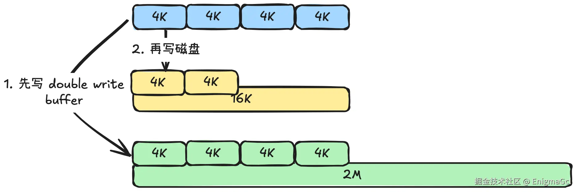 如何确保每次刷盘数据不丢失呢?MySQL 引入了 double write buffer 方案,听名字就知道是双写,先写一遍再写一遍,虽然叫 buffer,但其实本质是磁盘上的一块空间,具体思路是 innodb 调用 pwrite 刷盘时,先写 double write buffer,写完后再写磁盘,这样不管写 double write buffer 或者写磁盘过程中出现任何问题,都能恢复