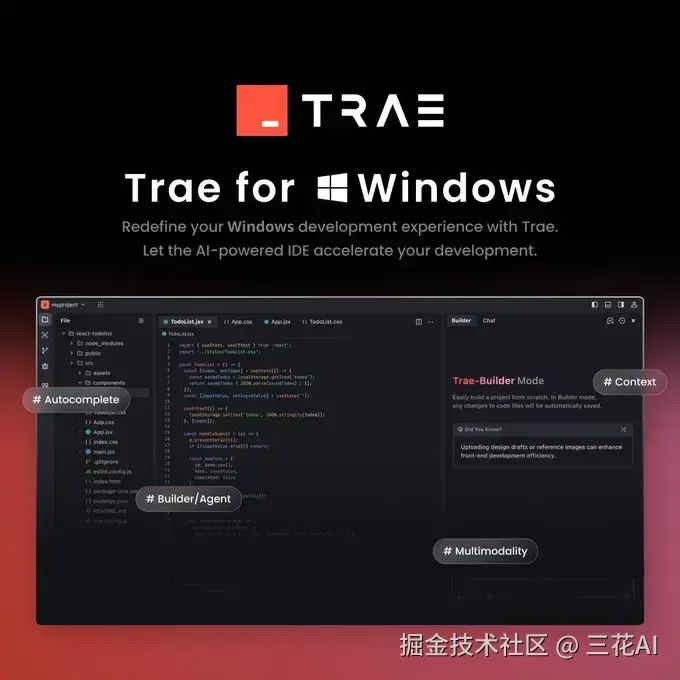 字节跳动推出的Trae AI 编辑器[4]现已正式上线 Windows 平台!