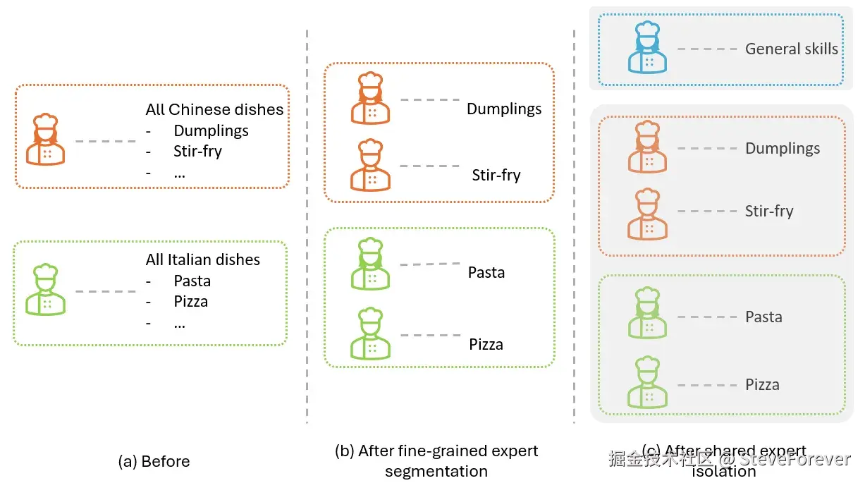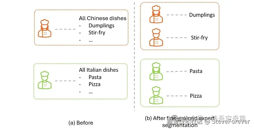 在我们前面的餐厅示例中,这类似于将每个厨师划分为专业技能,如下图所示。最初,我们由一名厨师准备所有中餐,另一名厨师处理所有意大利菜。在应用精细的专家细分后,将每种菜系所需的技能划分为多个专家,这样我们就会有一组中餐厨师和另一组意大利菜厨师,每个厨师只需要掌握该菜系的特定技能。