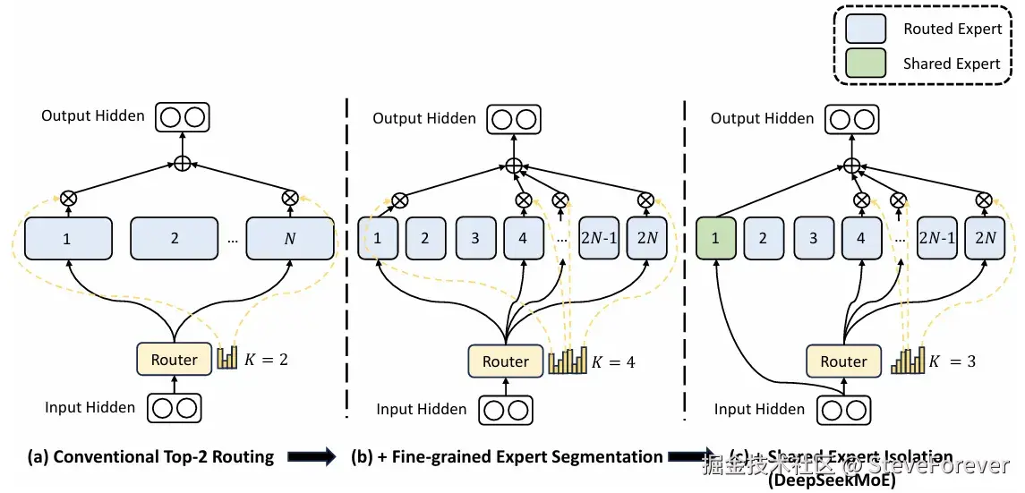 DeepSeekMoE 利用两项关键创新来平衡 MoE 中的知识专业化与知识共享,即细粒度专家细分(fine-grained expert segmentation)和共享专家隔离(shared expert isolation) 。