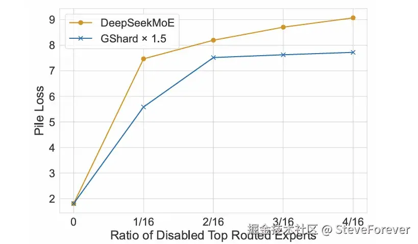 更具体地说,他们通过在 DeepSeekMoE 和 GShard x 1.5 中禁用顶级路由的专家来进行实验,后者作为基线,因为这两种方法在没有专家禁用时具有可比的 Pile loss,请参见下图中对应于比率 0 的最左点: