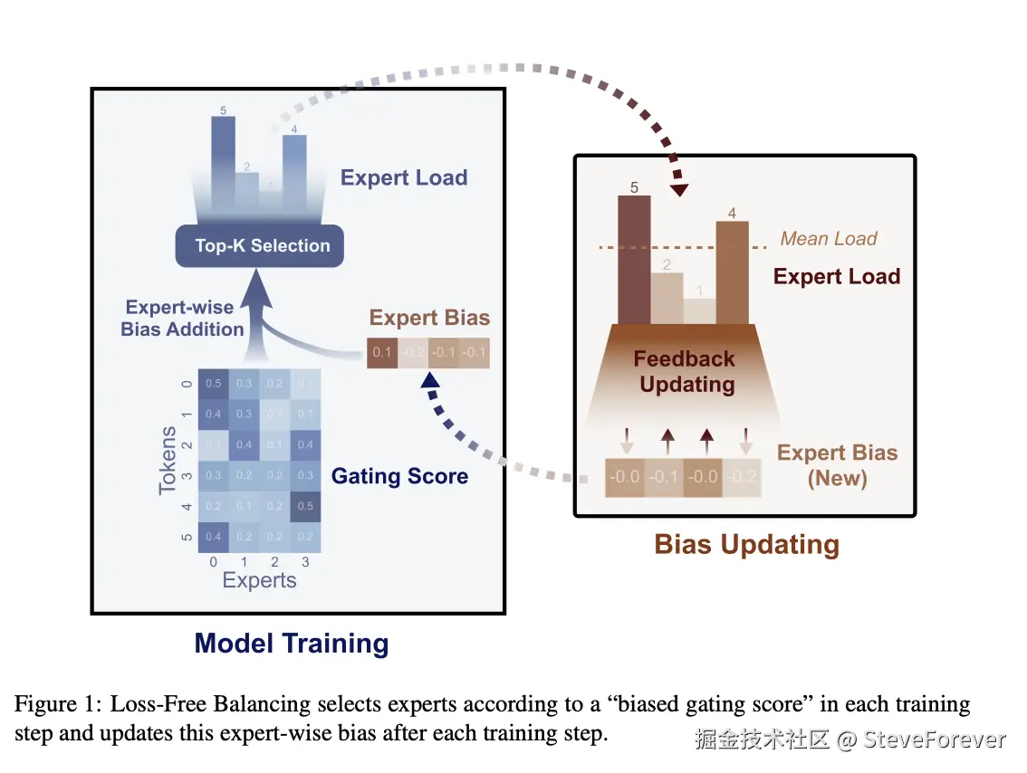 DeepSeekMoE 还提出了一些负载均衡策略,比如无需辅助损失的负载均衡策略。具体来说,作者采用了 DeepSeek AI 论文 Auxiliary-Loss-Free Load Balancing Strategy for Mixture-of-Experts[7] 中的负载均衡策略,具体来说,其通过动态更新每个专家的偏置(b)来维持专家的负载均衡,而不会引入额外的干扰梯度。