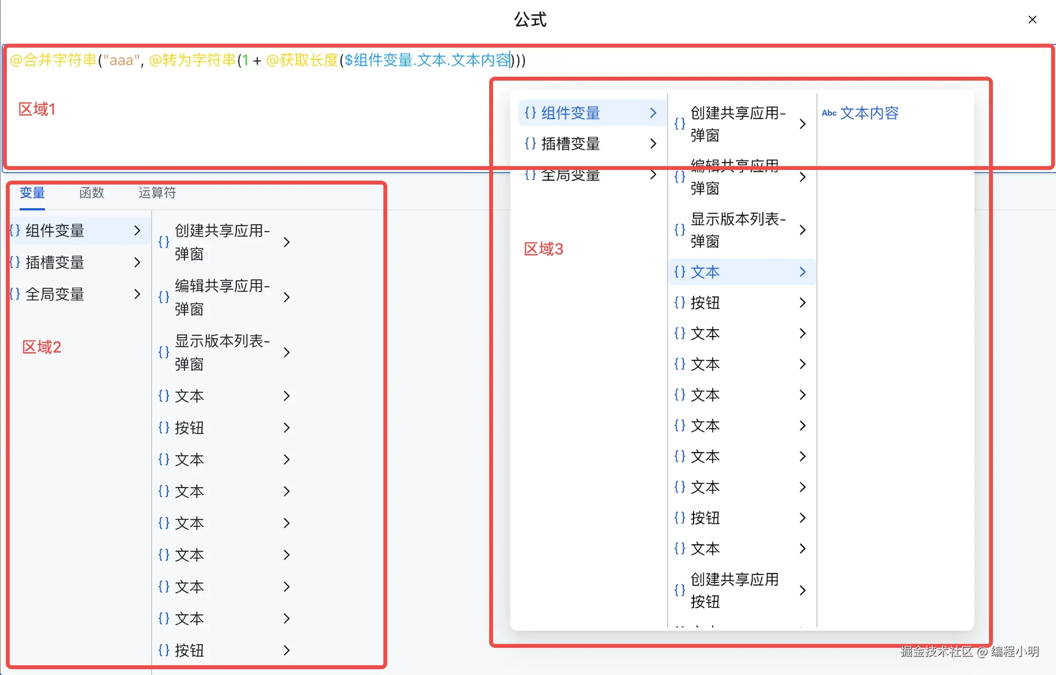 区域2: 可用的资源(这里支持了变量、函数、表达式等),用户点击此处的资源可快捷的填入区域1中