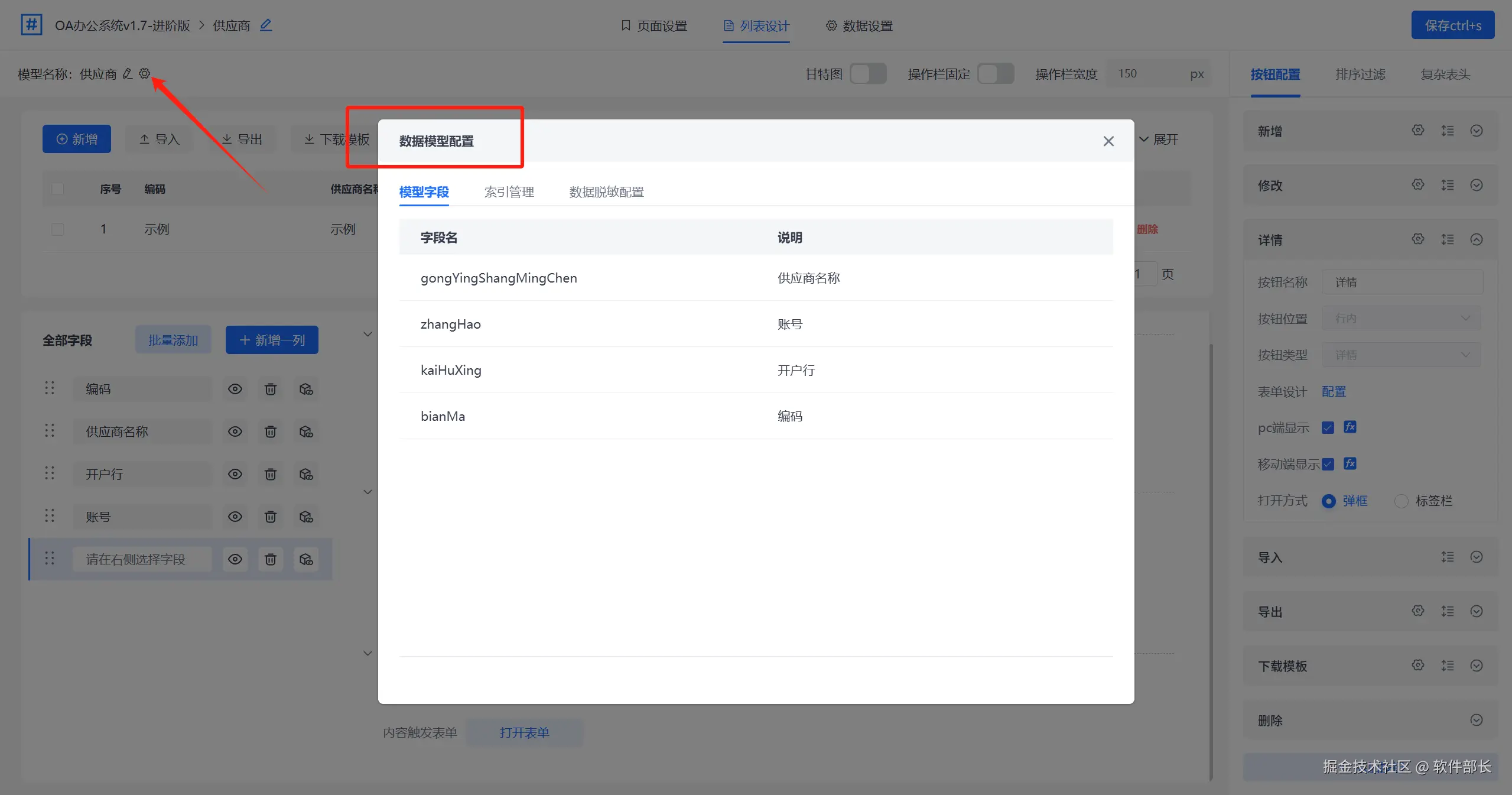 数据模型配置,这里的数据模型会根据我们界面上设置的字段自动创建库表结构