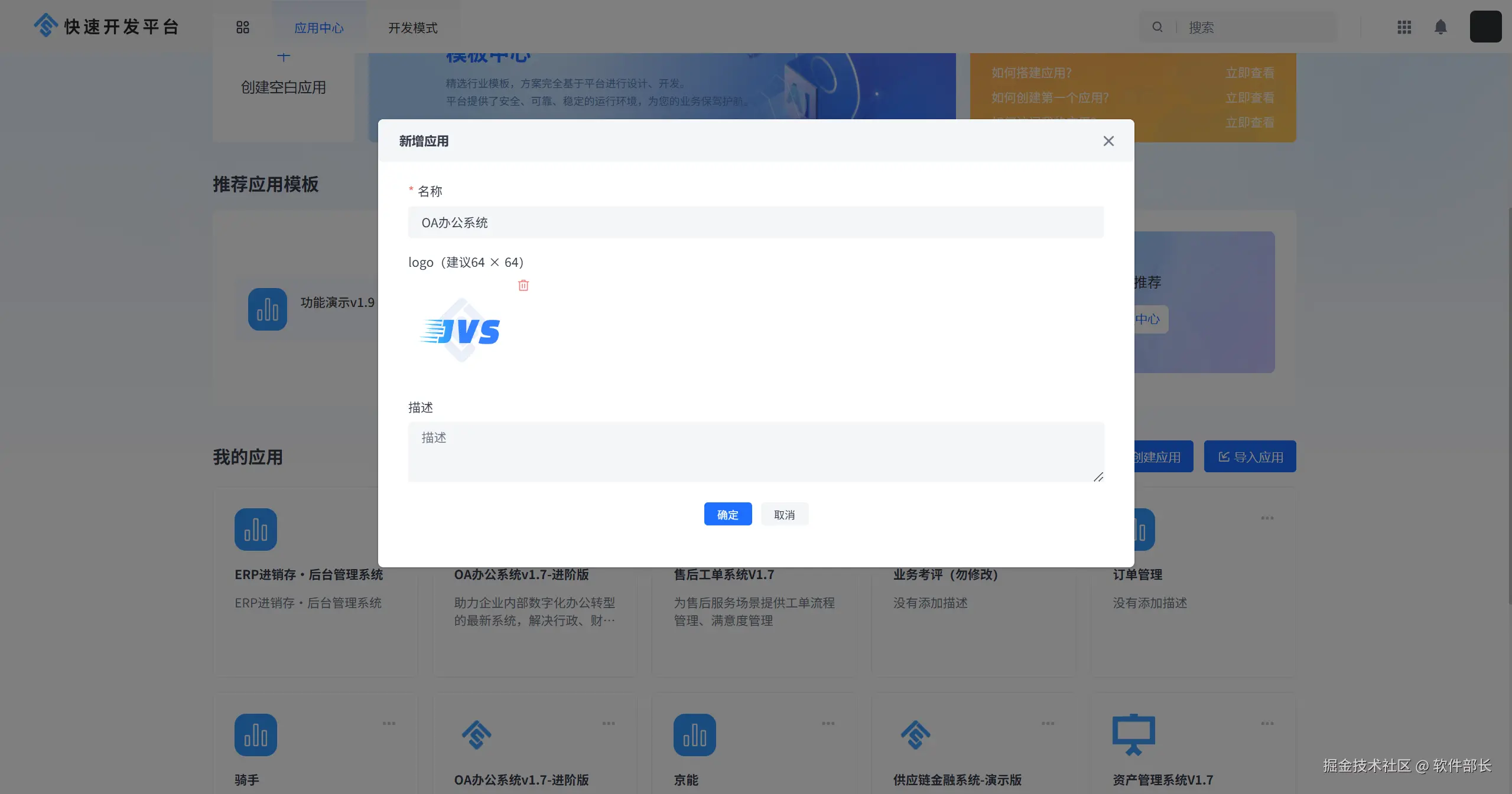 在JVS应用中心,需要创建一个新的OA项目。填写项目的基本信息,如项目名称、描述等。