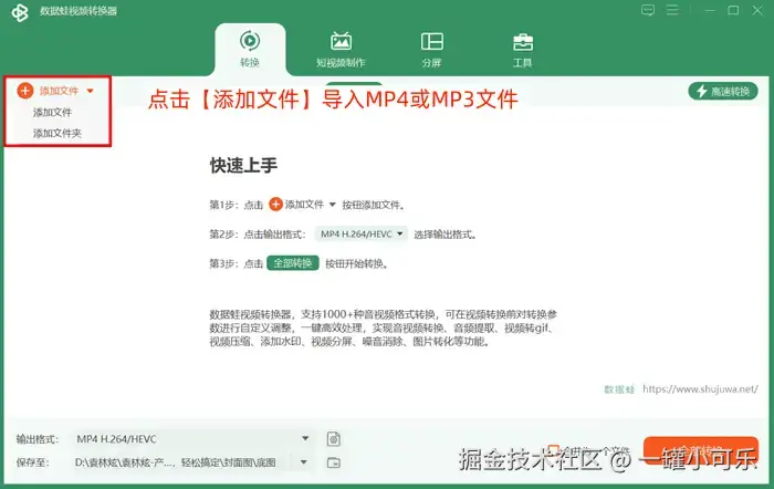 步骤1:运行数据 蛙视频转换器,在格式转换界面上点击【添加文件】导入MP4或MP3文件;点击【添加文件夹】则可以批量添加MP4或MP3文件进行转换。